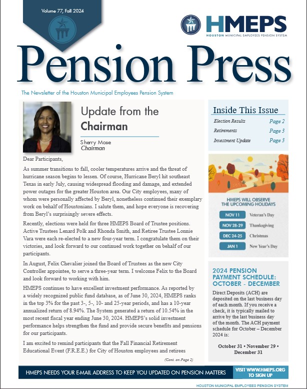 HMEPS recently learned that the City of Houston is offering a special incentive to retirement-eligible members. HMEPS is a separate entity from the City and does not administer or have specific details on the incentive, but will work diligently with retirement-eligible members and the City to process the expected increased number of retirements.